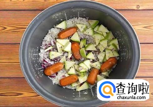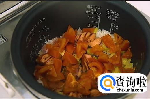 加入适量的水,大概需要到快要盖住食材的位置,将切好的番茄扑在最上面,选择快煮模式将米饭煮熟,舀出到便当盒,将所有食材搅拌均匀就可以开吃啦