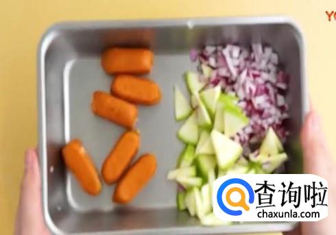 准备好之后把小瓜洋葱切碎,然后给脆皮肠划上切刀痕,使整道菜更加好看,番茄也要去蒂切块。