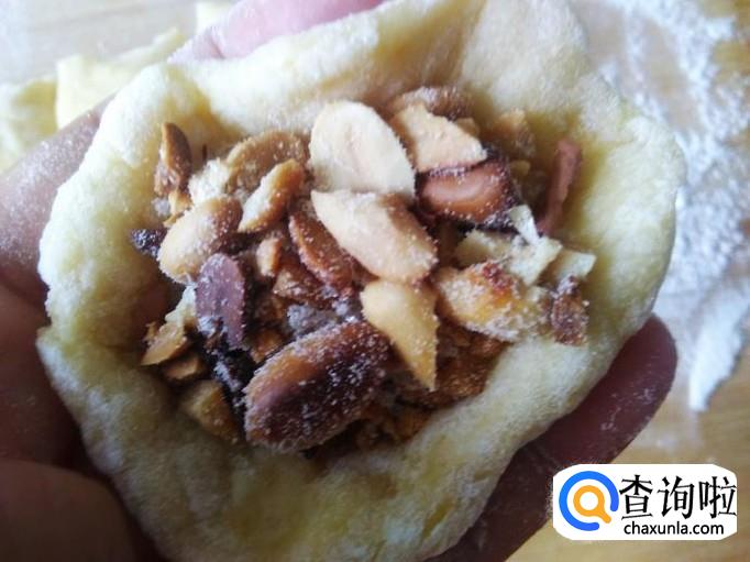 拿一段揉搓成圆球,然后捏成U型,装适量的花生馅进去收口揉压成饼。