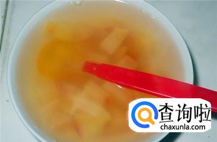冰糖融化之后,关火,稍凉倒出来,年纪小的宝宝可以直接喝水,可以吃苹果的宝宝喝汤吃苹果。