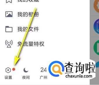 在手机屏幕左侧弹出一个窗口;手指再轻点一下窗口左下角的“设置”。进入到设置界面。