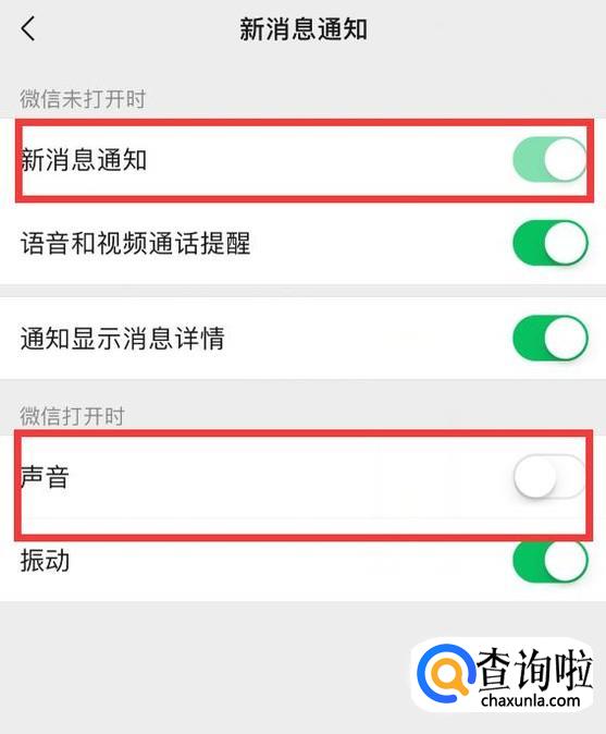 将“接收新消息通知”和“声音”这两个按钮打开。