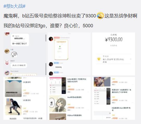 此外,从昨天开始,还看到网传消息称“B站五级号卖给蔡徐坤粉丝卖了9300”,这个价位,可以买上九张隔壁漫威炒到千元的“皇帝座”,还能顺便吃个火锅,当然,你问我信还是不信,我还是不信的……尽管如此,还是有不少人抱着不知道什么心态,在蔡徐坤相关贴吧、超话等地刷屏“卖号”,战况愈演愈烈……