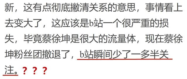 对此,ikun(蔡徐坤粉丝)们表示自己的爱豆受到了侮辱,粉丝团官微更是一·度表示将会退出B站。对此,有自媒体痛心疾首地表示,蔡徐坤粉丝团撤退后,“B站瞬间少了一多半关注”。