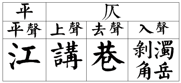 “平仄”泛指诗文的韵律,现有两套系统,一是以普通话为标准,简称为新声。二是以《平水韵》为标准,简称为古声。(一)、新声:现代汉语四声声调表中“平”就是第一声(阴平)、第二声(阳平),“仄”就是第三声(上声)、第四声(去声)。(二)、古声:古汉语将汉字分为平、上、去、入四个声调。平所指的就是古汉语中的平声字(包括现在汉语中的第一、二声中的大多数);仄所指的是古汉语中的上、去、入声。