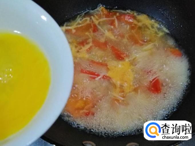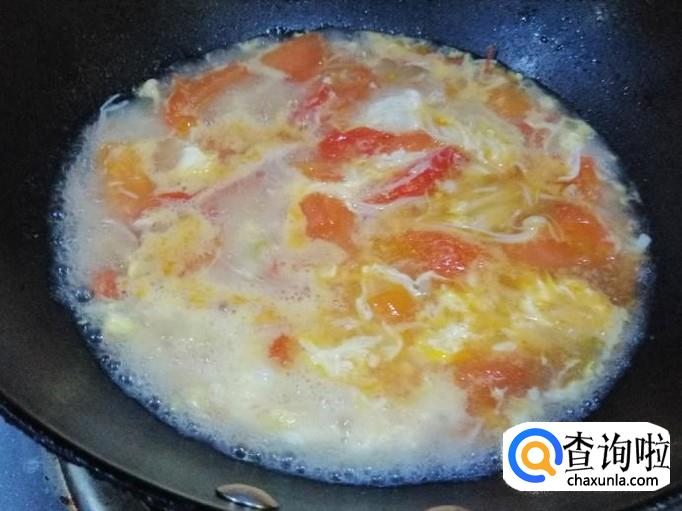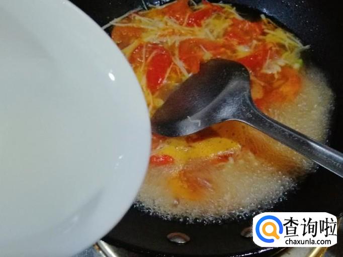 翻炒片刻后,锅中加入适量清水,煮开后先加入水淀粉,一边加淀粉水,一边用铲子搅拌汤,让淀粉水均匀融入汤中。