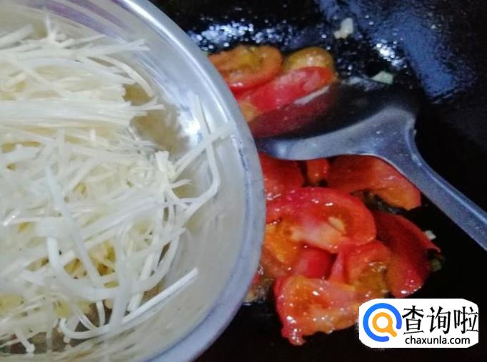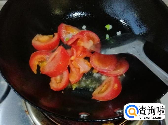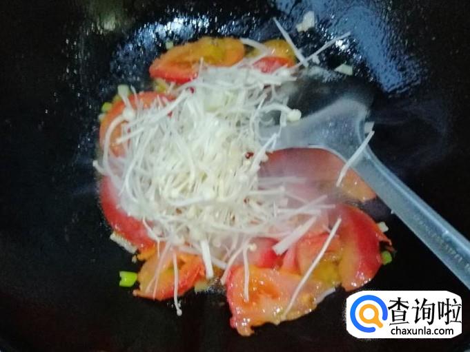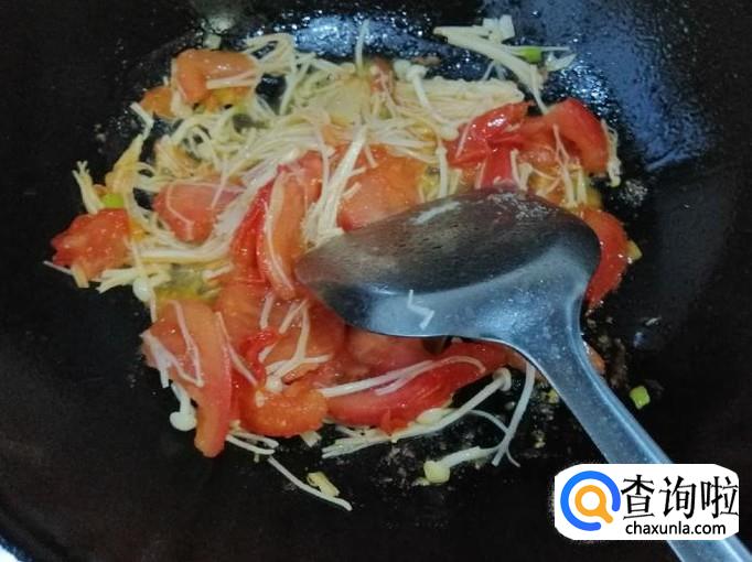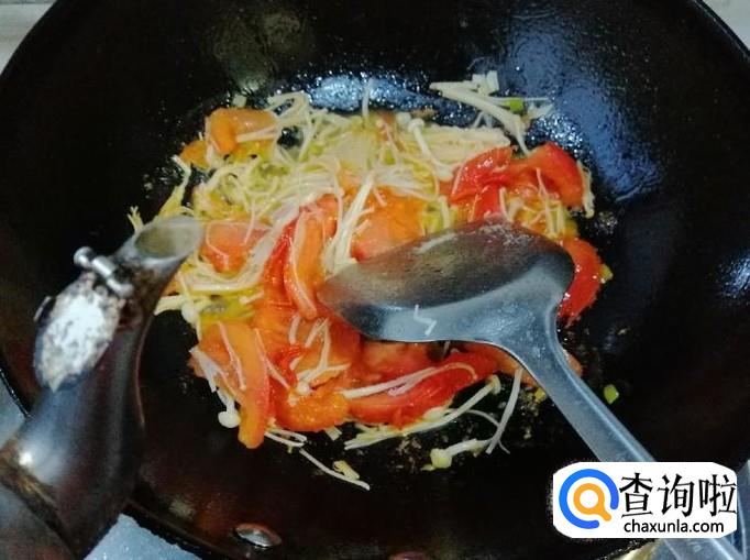 炒锅放油,油热后放入葱花炝锅,炒出香味后放入西红柿,用铲子快速翻炒均匀,然后加入备好的金针菇,翻炒均匀。