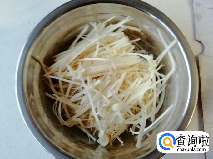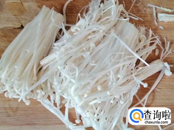取少许金针菇,用清水把金针菇洗净,去掉老根,把金针菇撕散开,用刀把金针菇从中间切开,一分为二装入容器待用。