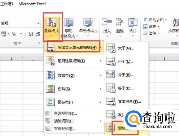 然后我们点击条件格式,之后我们点击突出显示单元格规则,然后我们点击重复值;