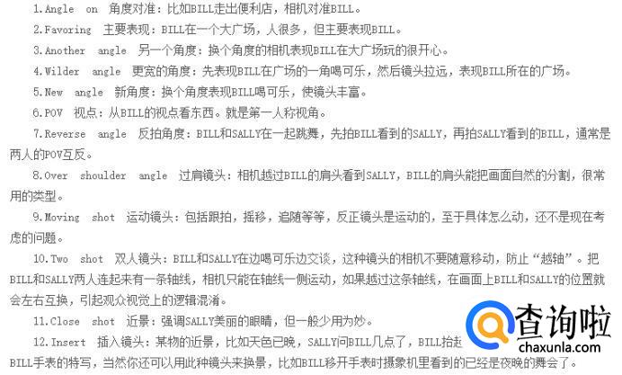 香港电影剧本里,每场戏的开头号都要占据一行,然后还要有时间、地点、人物和内/外景等,也要占一行,这也导致了香港电影剧本通常都是一大摞,字数非常多,如果是编剧,这些不用写也是可以的。在大陆电影界,有专门做分镜头的工种,所以不用操心这个了。不过电影剧本里很多术语是通用的,而且会显得更加专业,最好都要熟记下来并且运用到。比如Angle on 角度对准,Two shot 双人镜头,OS 独白,OV旁白等。
