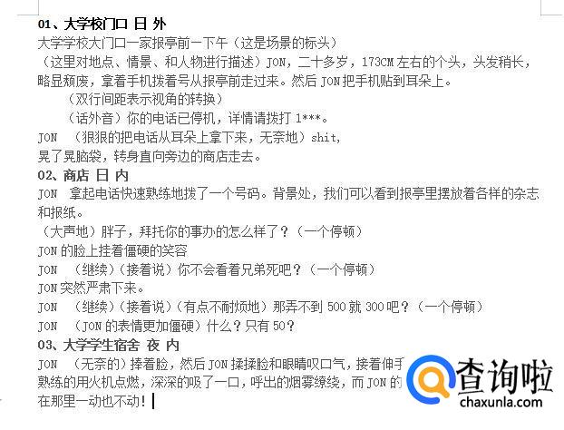 封面翻篇后,直接就要写正文,剧本的正文一般包含四种格式,有大陆格式、香港格式、台湾各式和美国好莱坞格式。我们介绍下大陆格式,大陆格式首先正文中间,名字,之后标注场号(电影拍摄就是按照这个场号来拍摄的,所以不要标注错了)、地点(也叫场景)、时间(白天或者黑夜)然后接上正文。
