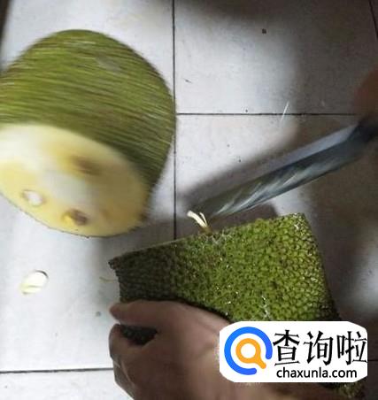 开始用刀切,最好选择厚的水果刀,更容易发力,否则菠萝蜜厚厚的皮不容易切断。边切边用手辅助剥。