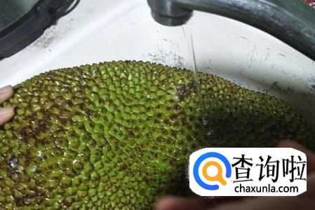 一般刚摘下来的菠萝蜜不能立刻吃,需要放几天等待自然熟。放大概一周左右后,可以闻到一股自然的香甜的气味,这时也可以开始切了。切之前先将接口处用水反复冲洗几次,保证将浮尘清洗掉就可以。