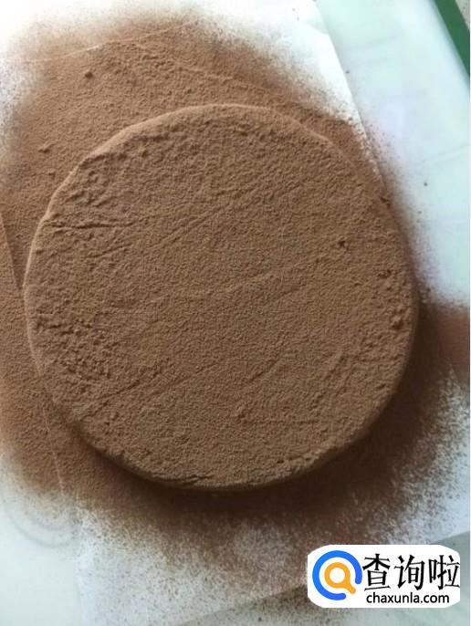 将溶液倒入容器中,并用蛋糕模具做成圆形。表面撒上一层可可粉。