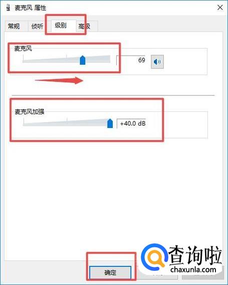 之后,我们点击级别,然后将声音的大小按钮向右滑动,之后将麦克风增强直接拉到最大,之后我们点击确定就可以了。