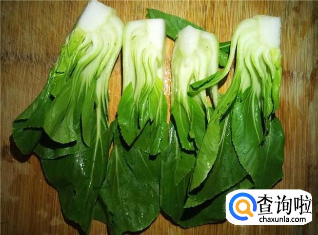 上海青用刀子对角切成4大块,然后清洗干净。