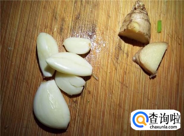 准备好所有材料:上海青4颗、蒜头4瓣、姜适量。