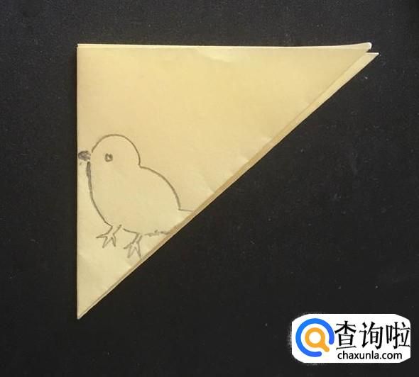 用铅笔在彩纸上画上一只小鸡,注意鸡脚更靠近正方形彩纸的中心。