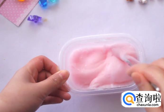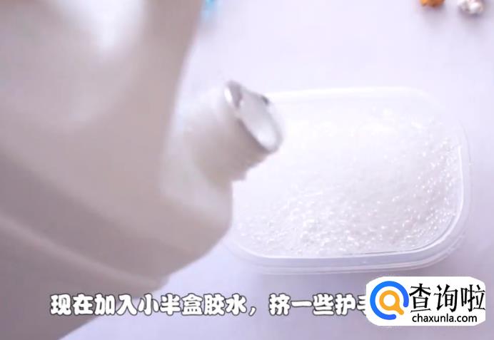 加入小半盒的胶水,并挤入一些护手霜,用勺子混合均匀。因为护手霜是粉红色的,所以这里我们就不用再额外添加颜色了。