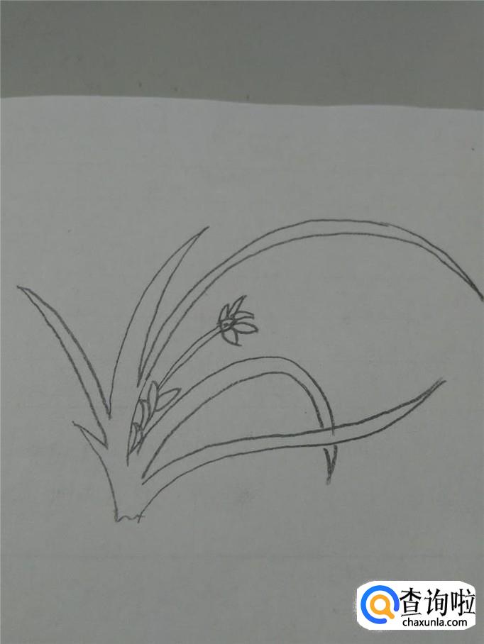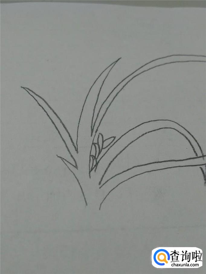 在花骨朵的上面画两条弯弯的线,表示花茎,在花茎末端画一朵简单的兰花,只画几片树叶形状的花瓣即可,到此,兰花就画完了。
