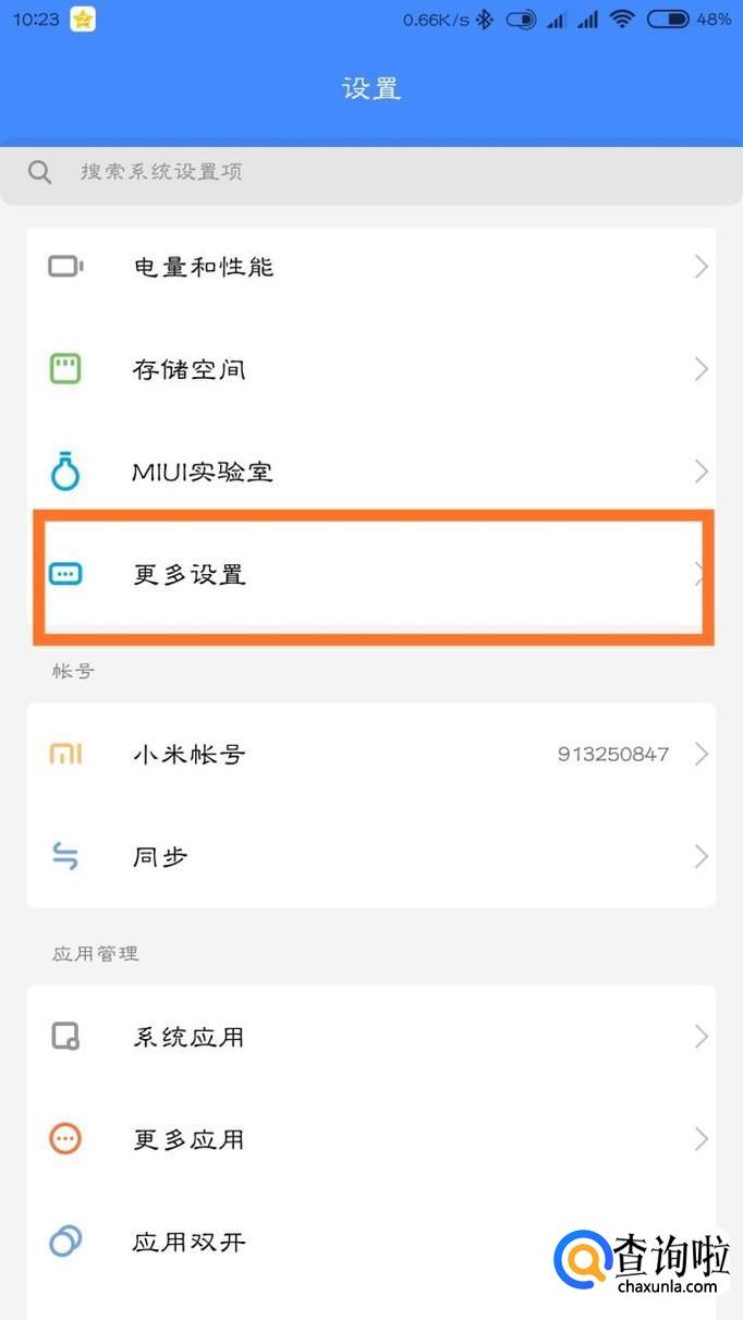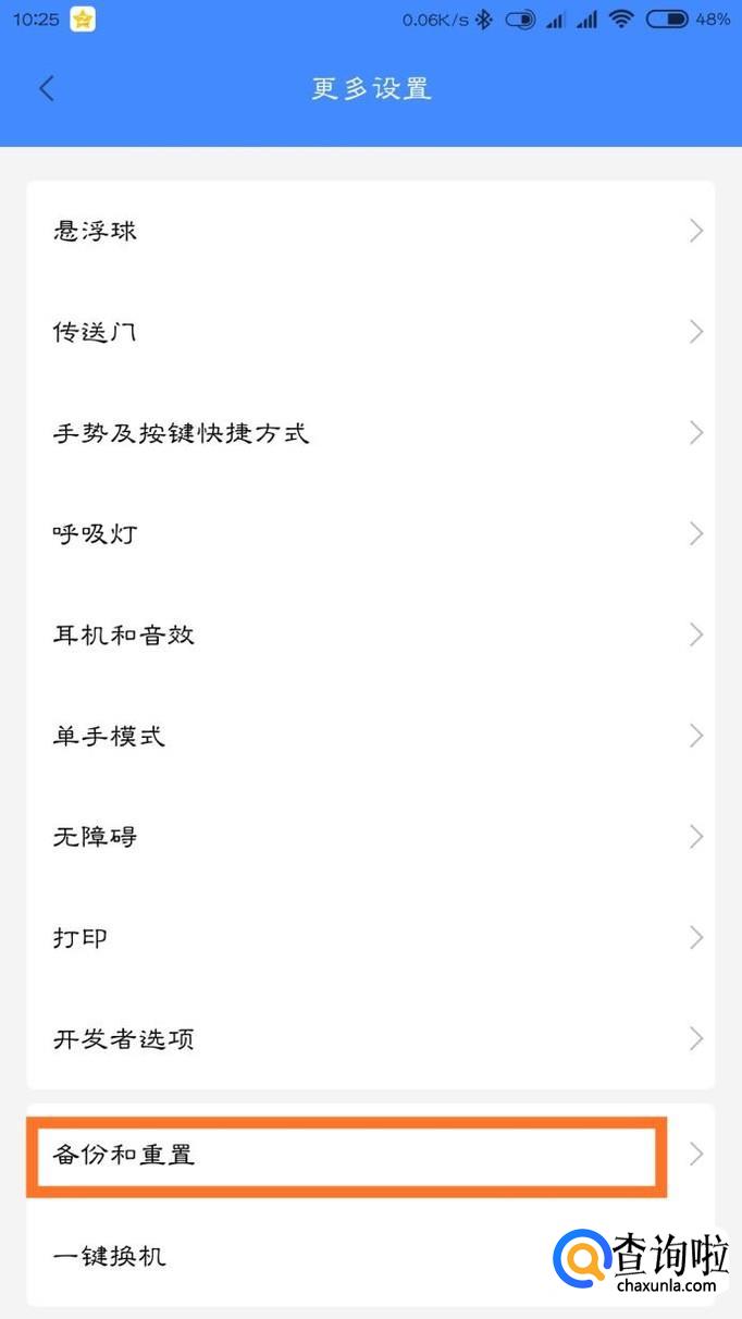 先打开手机的设置,然后在“系统和设备”里面找到“更多设置”,拉到最底部找到“备份和重置”,点进去。