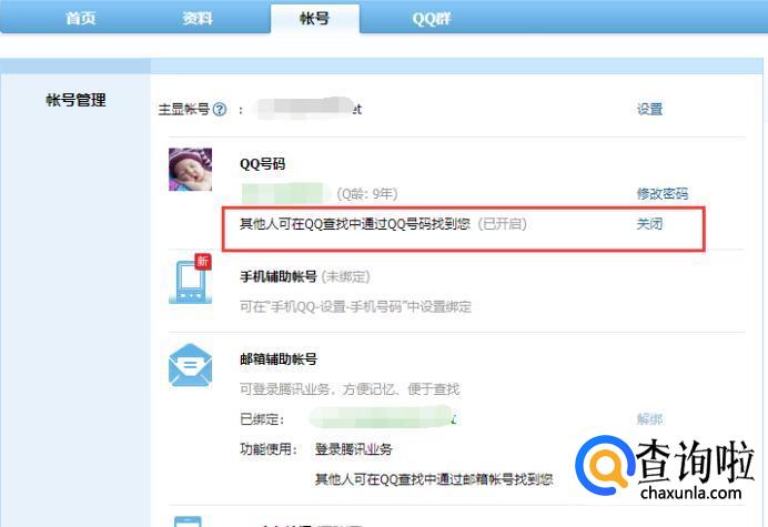 然后找到“其他人可在QQ查找中通过QQ号码找到您”,点击开启