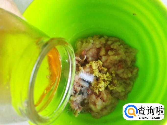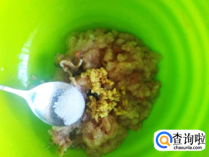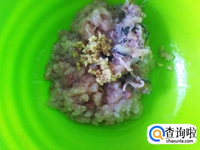 把鱼肉剁成肉饼,加适量的盐、姜蓉、2勺香油。