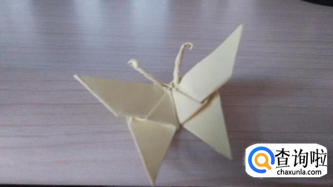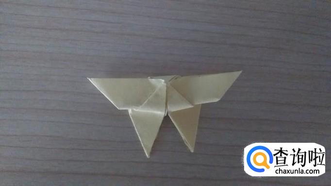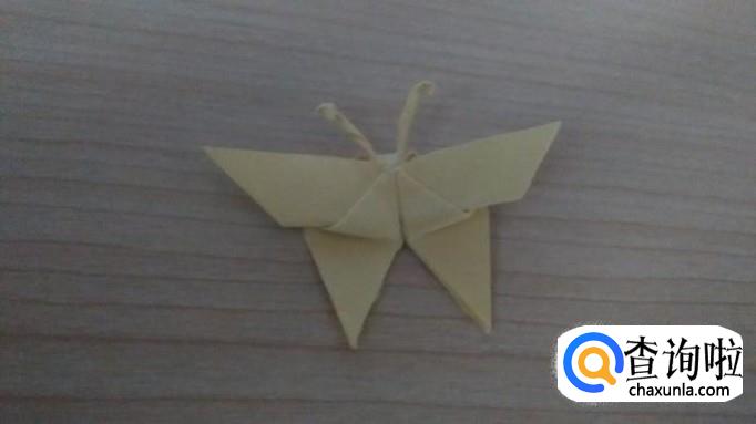 翻回另一个面,把刚刚的小角扣下来,扣紧,蝴蝶的形状差不多就显现出来啦,如果你觉得不够结实,你可以用双面胶固定一下。