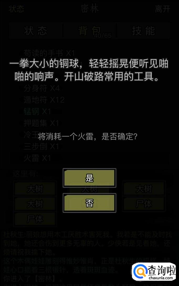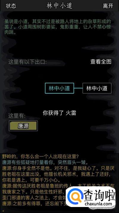然后来到林中小道捕风卫这个位置然后往左走和唐源对话,然后切磋,成功之后再对话两次,他会给你一个道具——火雷。