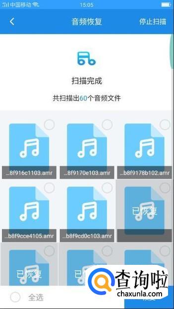 最后,扫描成功后,我们勾选出需要的音频文件,点击手机右下角的‘恢复’即可完成啦。