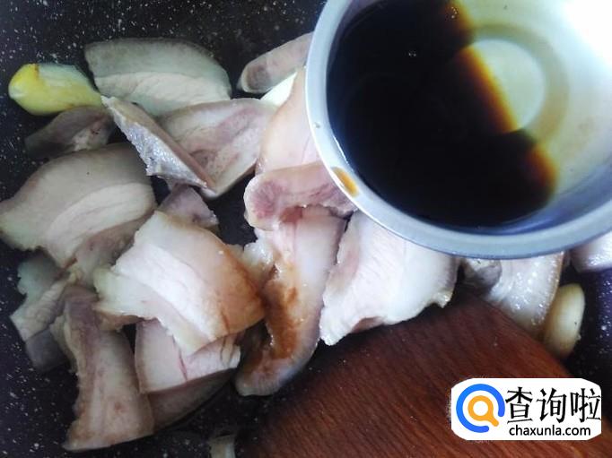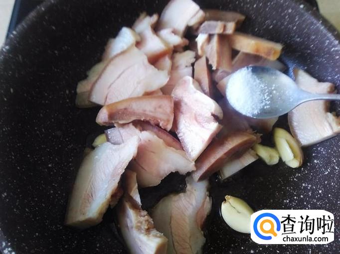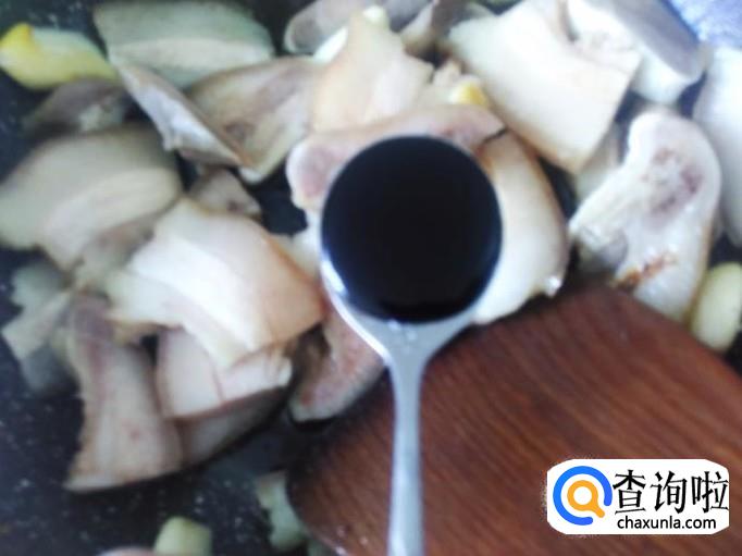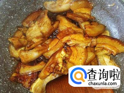 猪头皮下锅,加适量的盐翻炒一下。