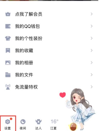 1、打开手机QQ,点击左上角的头像,在菜单页点击左下角的设置;