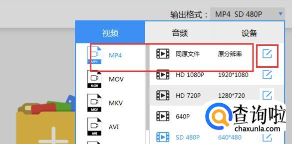 随后设置右上角的输出格式,将格式设置为MP4。如果还想设置分辨率和其他参数的话,还可以点击右边的编辑图标进行设置。