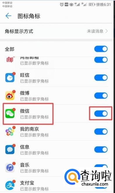 弹出的界面,我们找到微信,然后我们将微信的角标图标向右滑动打开,这样我们就设置好了。