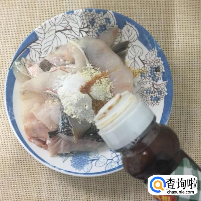 接着往鱼片中加入适量的地瓜粉、1勺的盐巴和1勺的味精、还有适量的酱油,腌15分钟。
