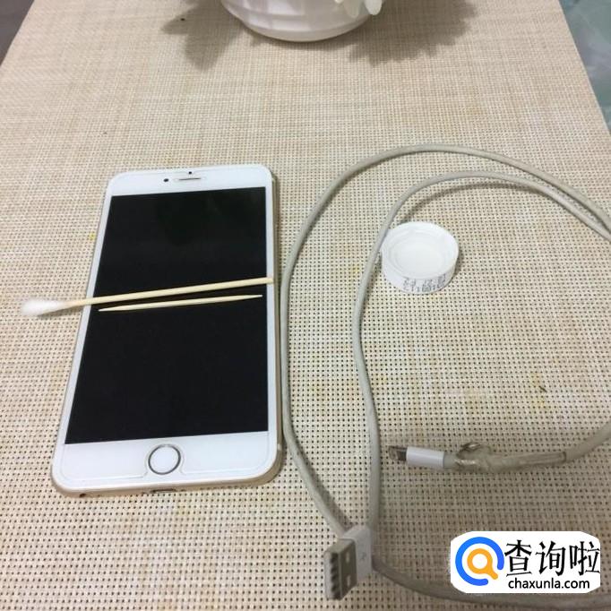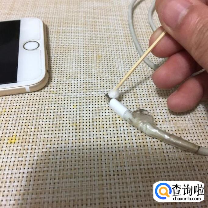 接着用牙签取出棉签上的一小团棉花并沾上适量的酒精擦拭苹果手机的充电孔,如下图所示。