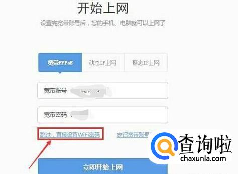 宽带PPPoE,根据宽带运营商提供的 宽带账号、宽带密码,在链接页面上填写宽带账号、密码进行拨号上网。点击立即开始上网。
