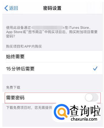 3.在此您可以选择“始终需要”或“15分钟后需要密码”,然后将“免费下载”下方的“需要密码”按钮进行关闭。