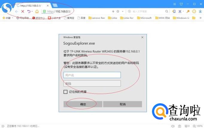 唤出"搜狗高速浏览器"程序窗口,如图所示。地址栏输入无线路由器WEB管理地址,唤出登录页面输入用户名和密码。