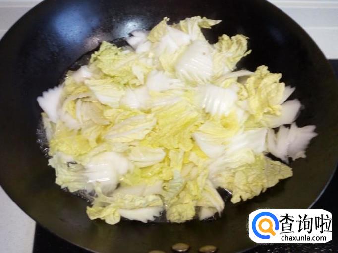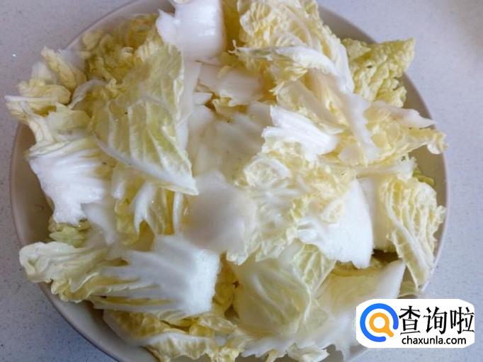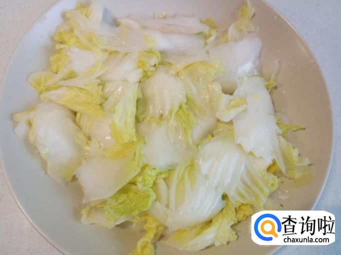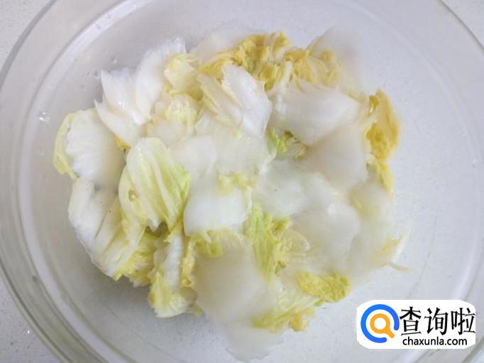 大白菜放入开水中焯一下,入锅10秒钟即捞出,迅速用冷水过凉,控干水分。