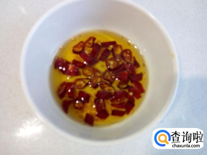 锅内放入油加热,油七,八成热时关火。稍凉后,倒入红干椒的碗中,炸成辣椒油。