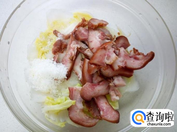 把焯好的大白菜放入碗中,再用手按压一下,挤出上面的水分倒掉。然后放入切好的猪头肉,放入盐,味精,白糖,醋,拌和均匀。