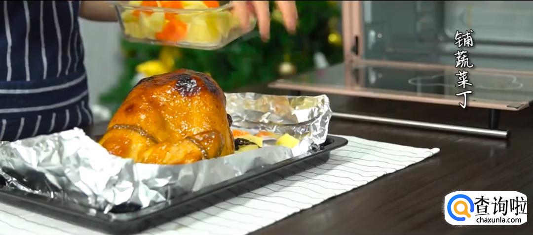将反复烘烤的烤鸡取出,放入蔬菜丁,然后淋上酱料放进200度烤箱继续烘烤40分钟。