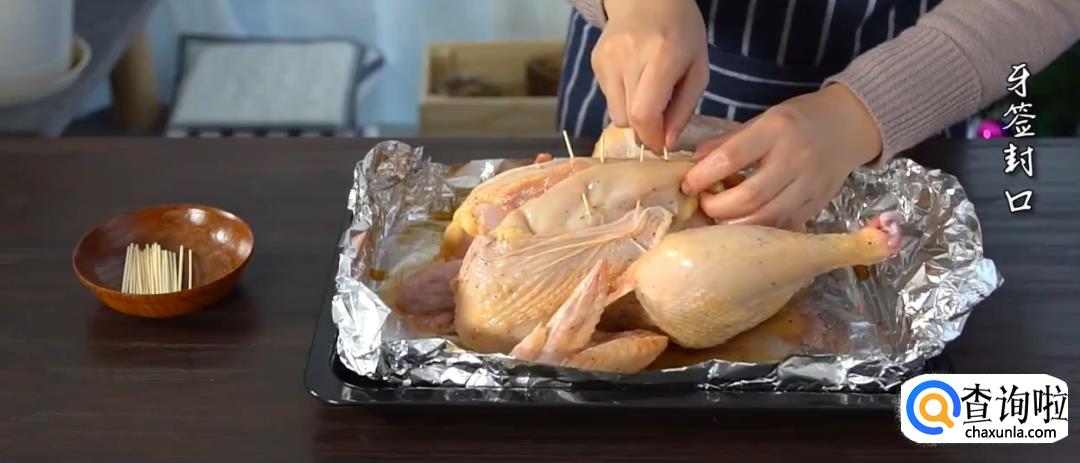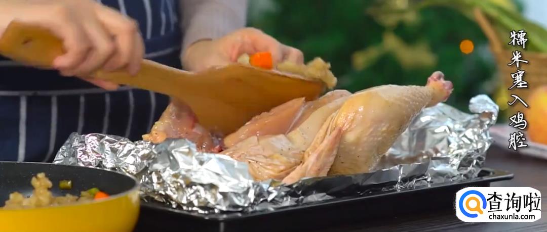 将炒好的糯米饭塞入鸡肚子中,用牙签封口,用绳子将鸡腿捆住。