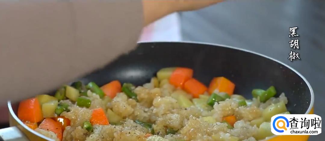 热锅起油,下糯米进行翻炒,然后倒入蔬菜丁,加黑胡椒翻炒均匀。