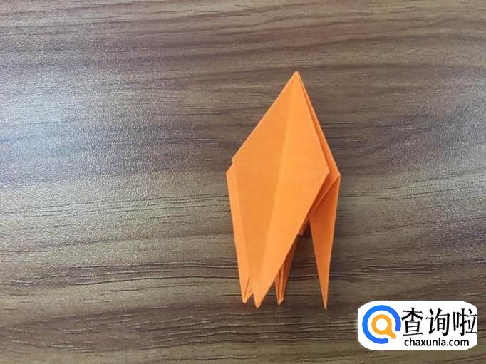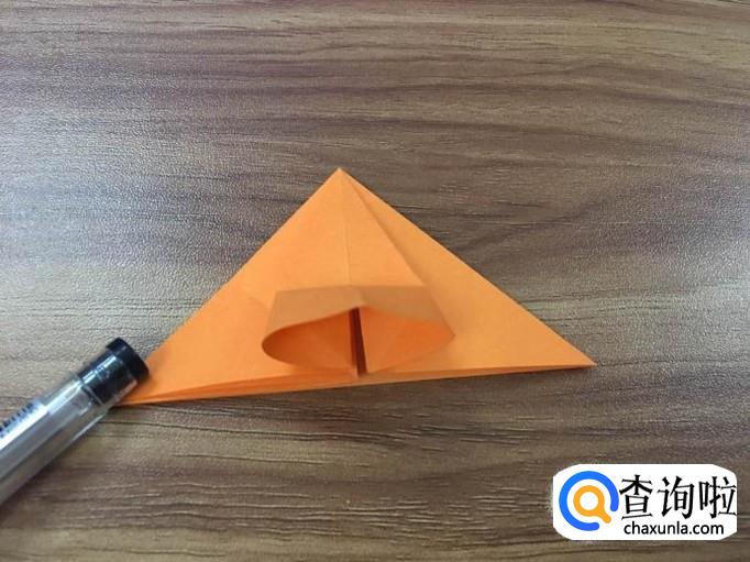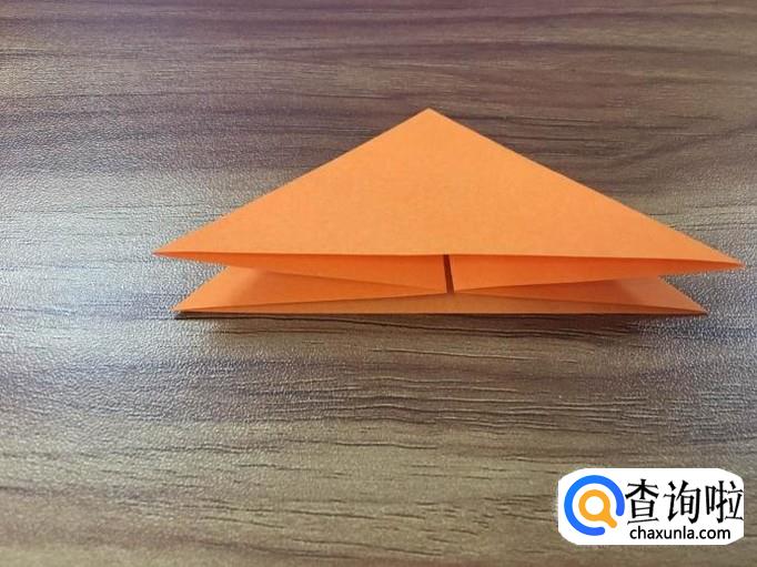 将刚才折的两个小三角摊开,先将右边的一角立起,从中间将其压平,压到刚才折的痕迹那里,再把翘起的口向顶点折。如下图