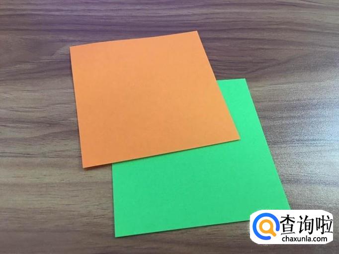 准备两张正方形纸,颜色最好有一张是绿色的。将其中一张的正方形对折成三角形。