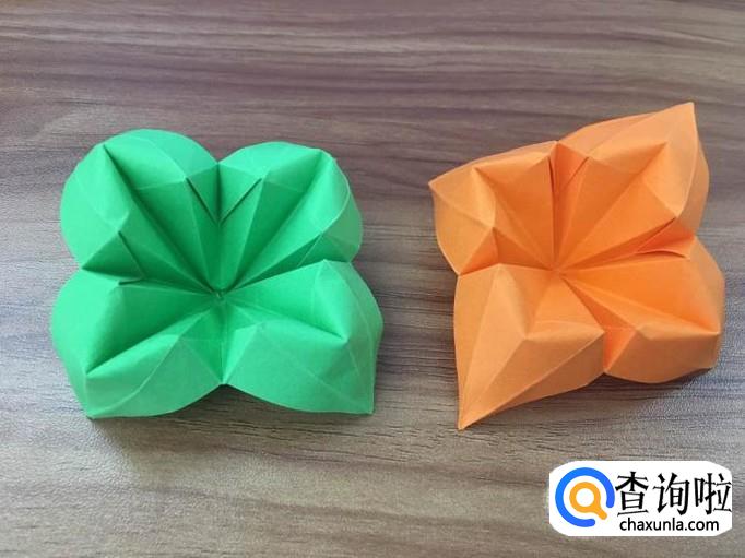 拿刚才的绿色正方形纸以同样的方式折叠好,将先折的花朵放在绿色花朵上,交错下,就会有鲜花绿叶的样子出现。四叶花就完成了。