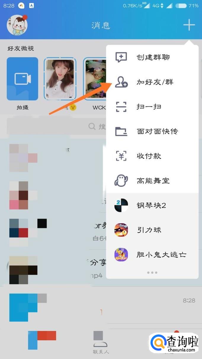 首先打开手机QQ,点击右上角,然后点击子菜单里面的“加好友”。