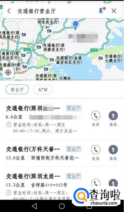 还有一种方法是,打开手机上的地图软件,你输入交通银行之后,地图会自动帮你搜索离你那里最近的营业点或者有ATM机的地方。